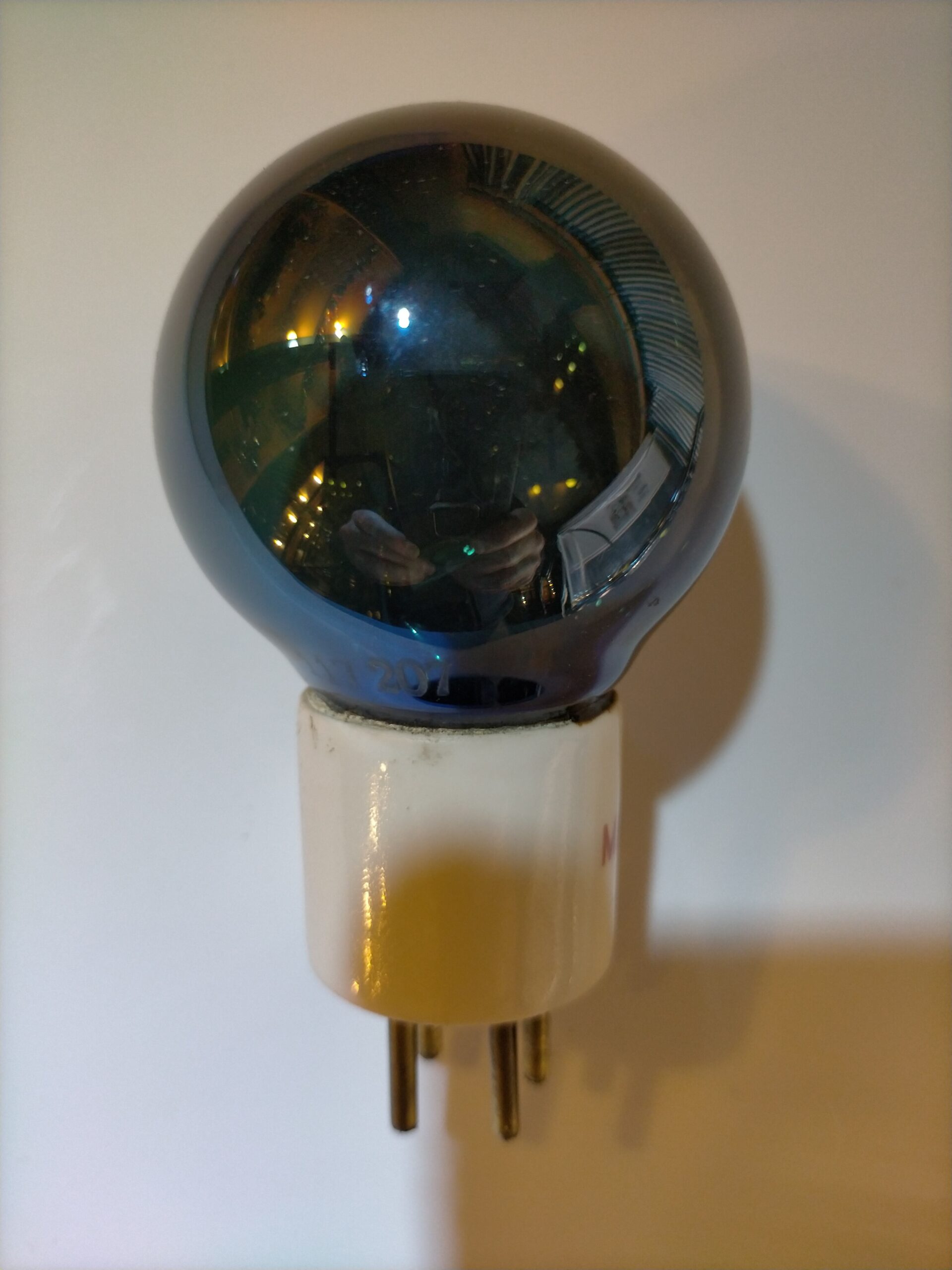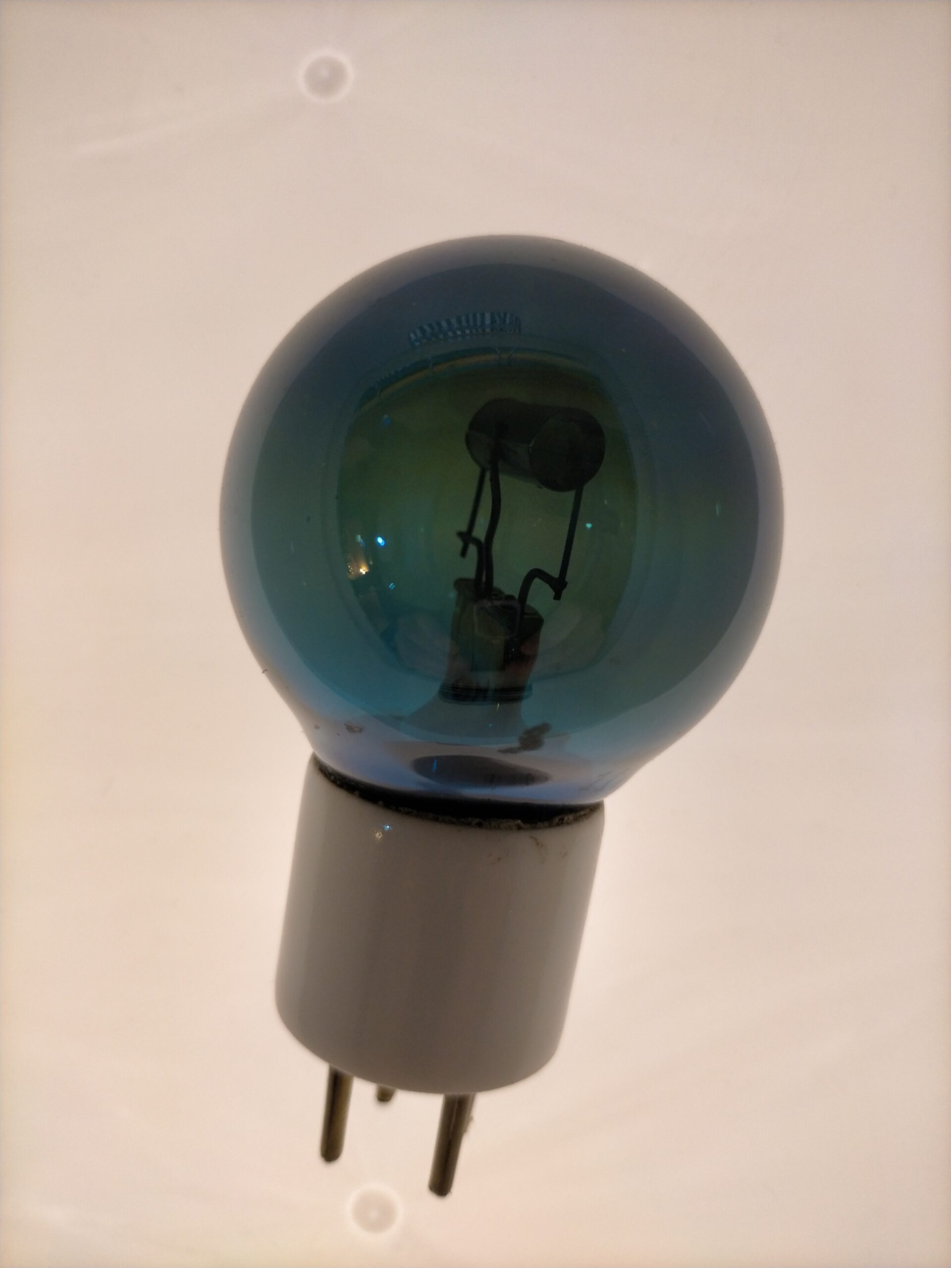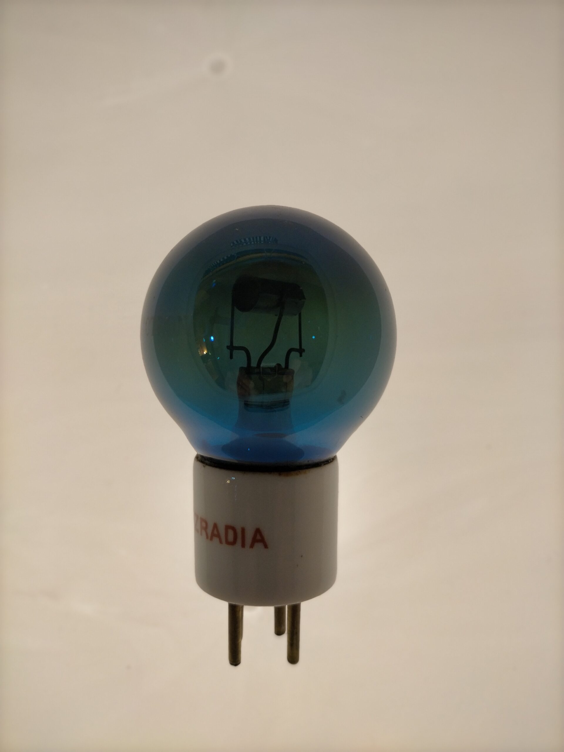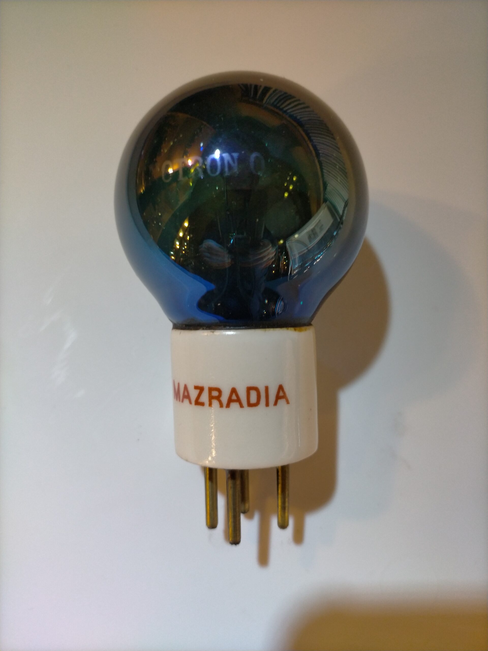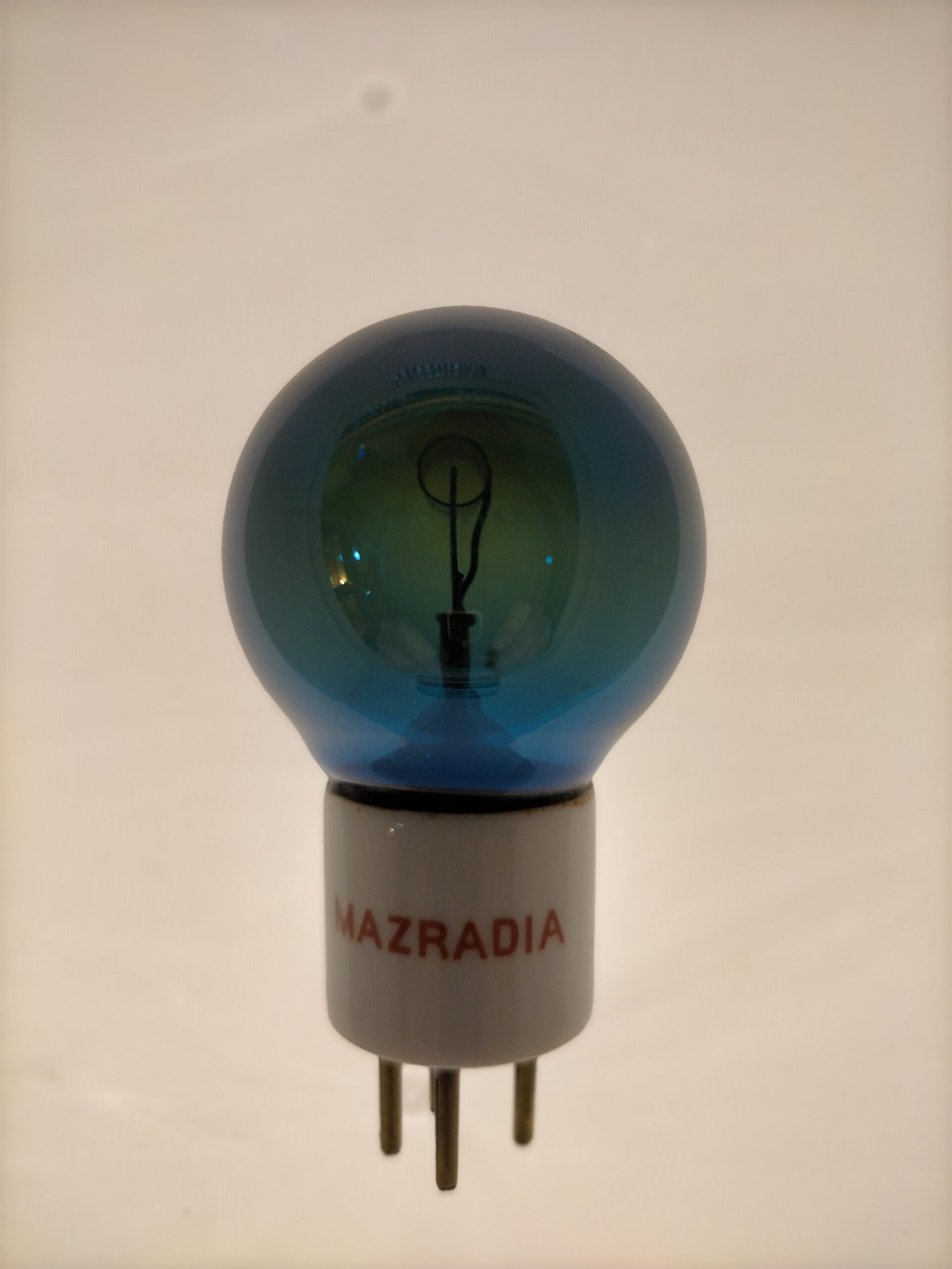 Diodo sferico Mazda con vetro sferico tipo R con rarissimo vetro blu . Scatola originale con marchi e disegni.