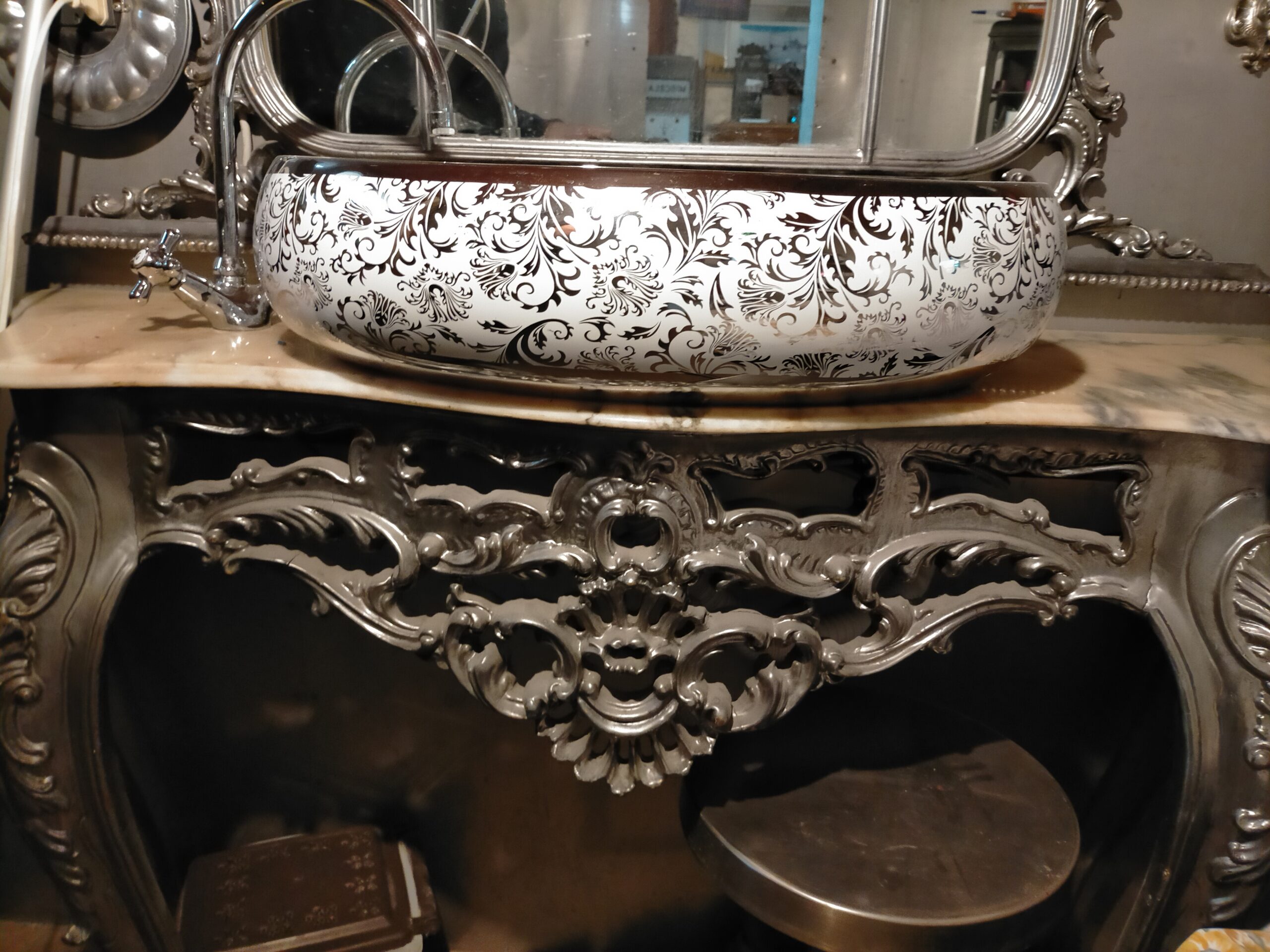 lavabo barocco in stile postmoderno in legno ceramica e marmo. verniciatura cromo. 1000/1500/3000 Valore: 1500 Rarità: pezzo unico