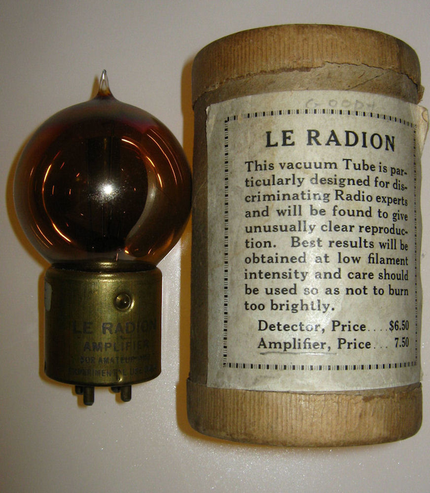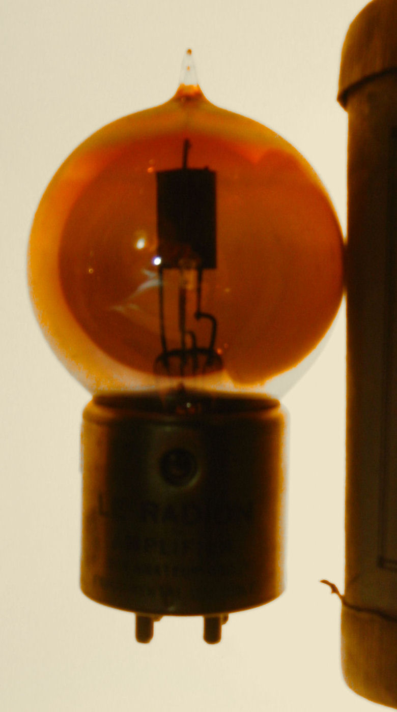 Triodo statunitense Le Radion in scatola originale completa di coperchio. La valvola ha il vetro ambrato rosso giallastro ed è in ottime condizioni.