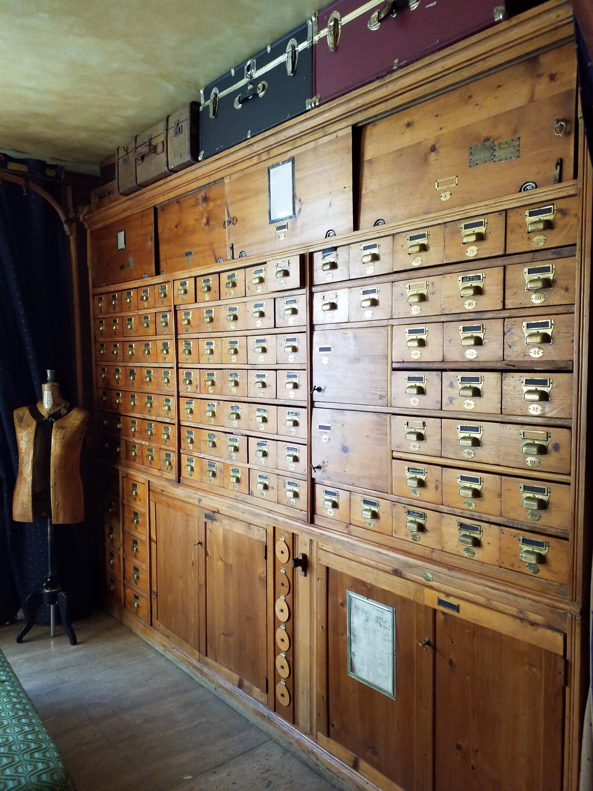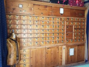 mobile cassettiera a 110 cassetti. Bellissimo mobile in legno con cassetti di varie dimensioni, modello da ferramenta o da agraria. finimenti in ottone. Restaurato in maniera soft, conserva tutta la patina del tempo. Maniglie e componenti in ottone, sportelli scorrevoli e sportelli a cerniera.