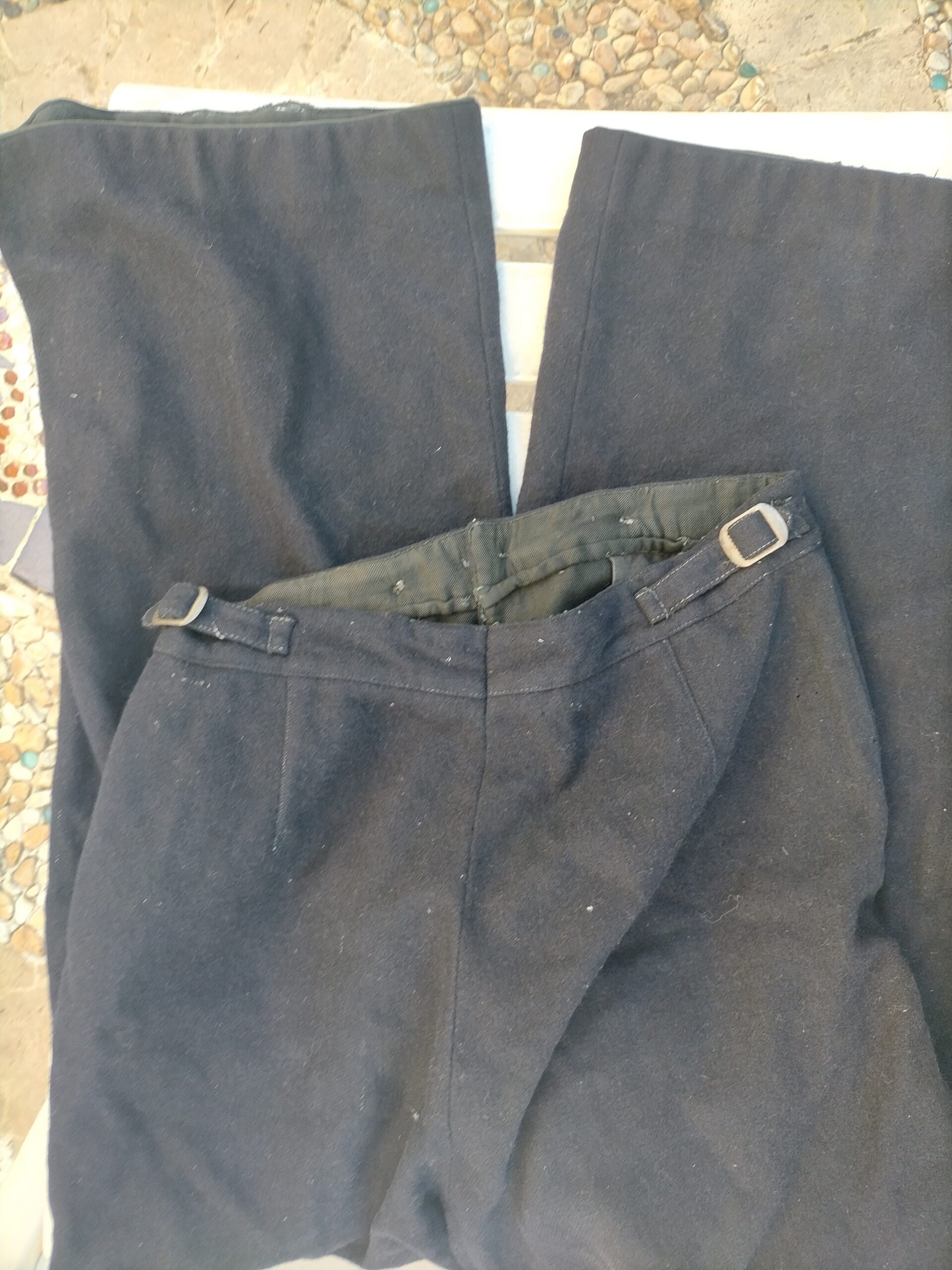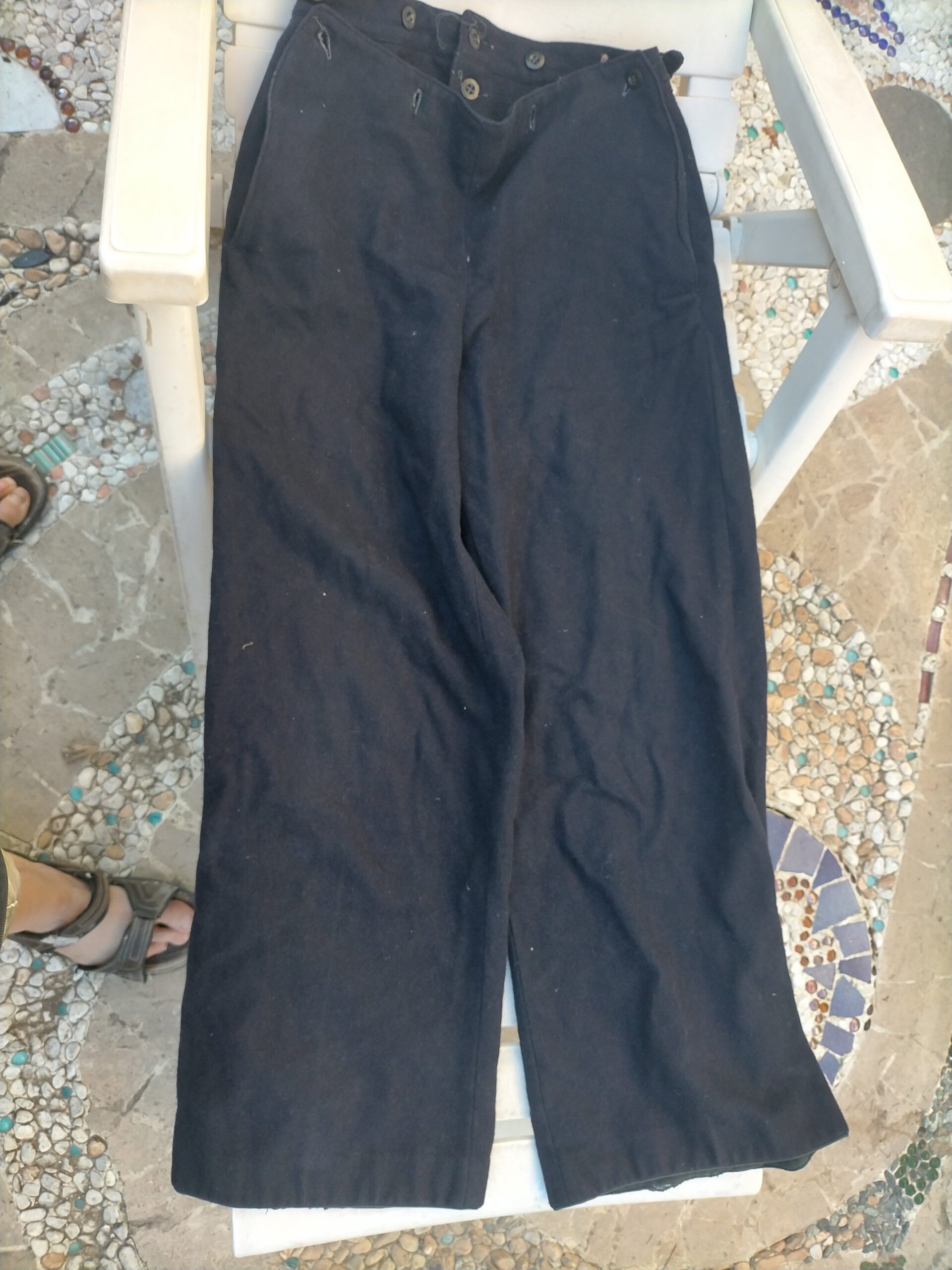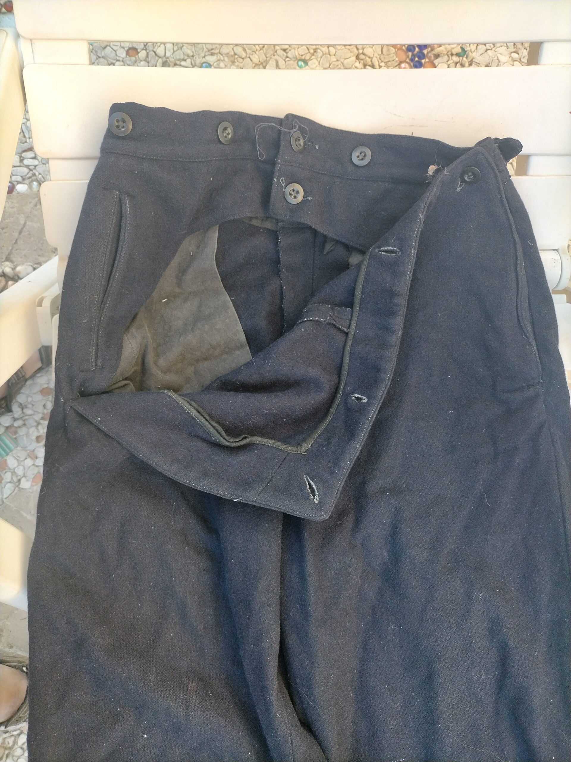pantaloni in lana blu da marinaio della Marina tedeschi 2Guerra Mondiale. Modello con pattina anteriore a doppia fila di bottoni , tipico della marina. 200/250/350