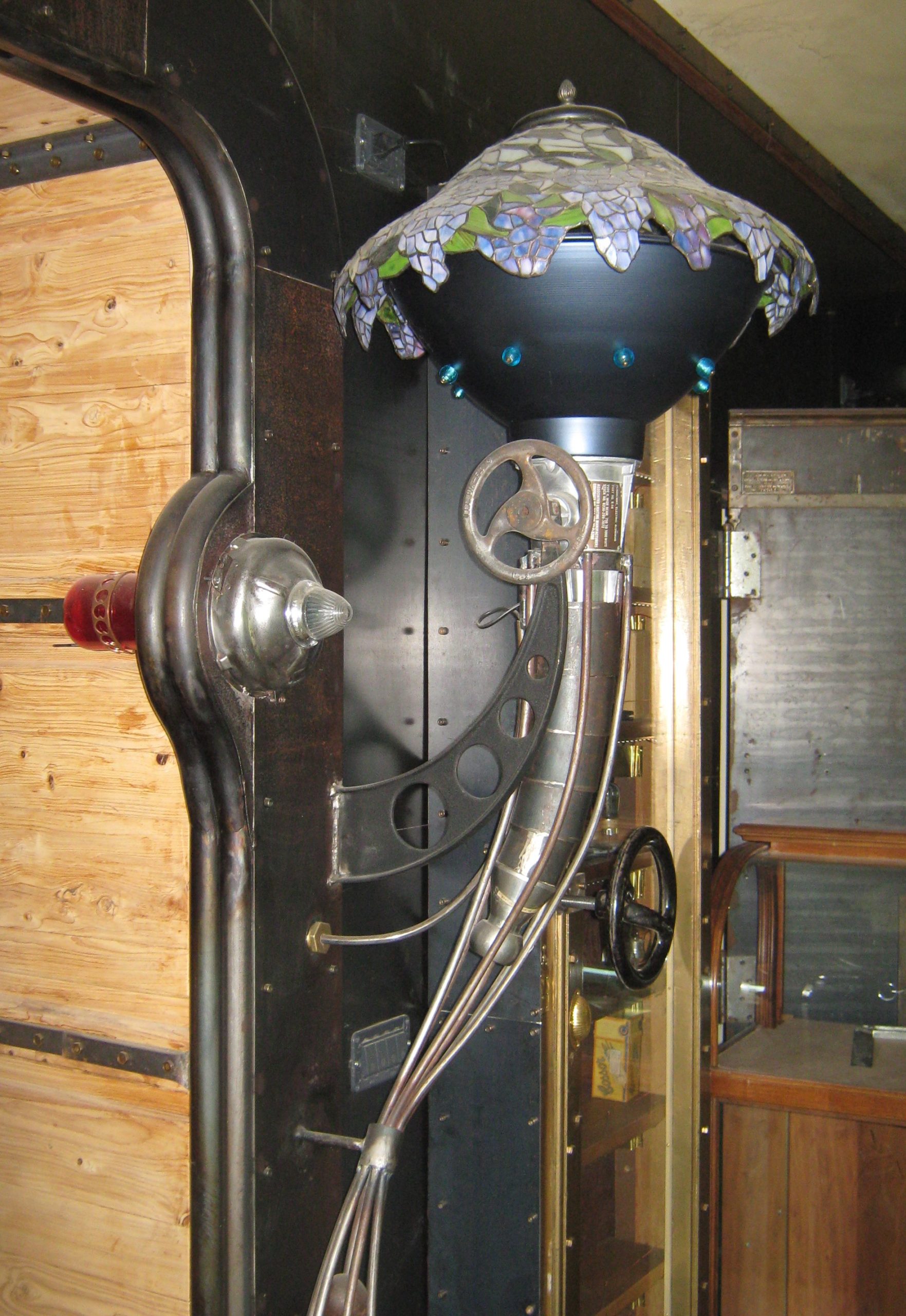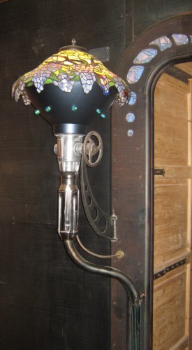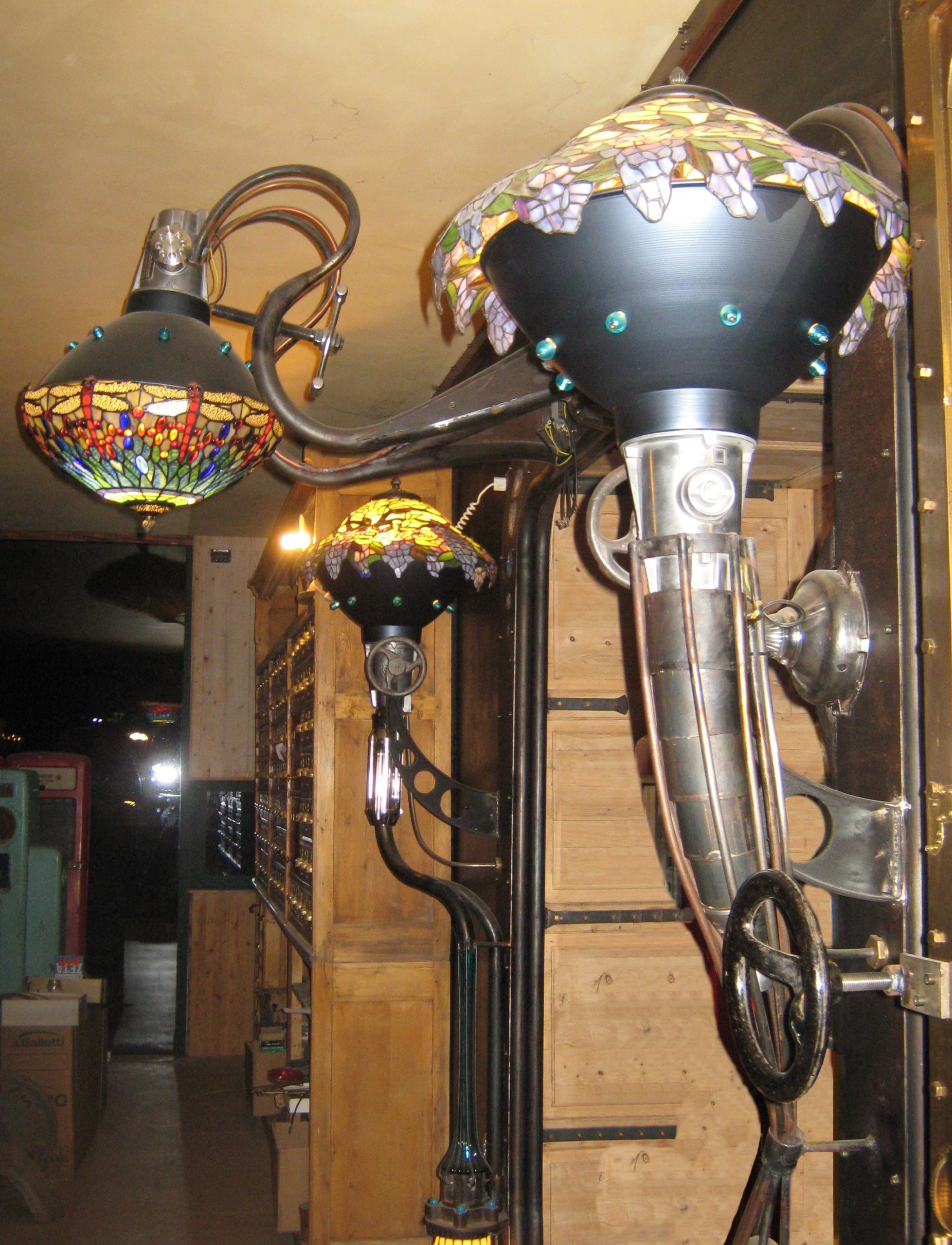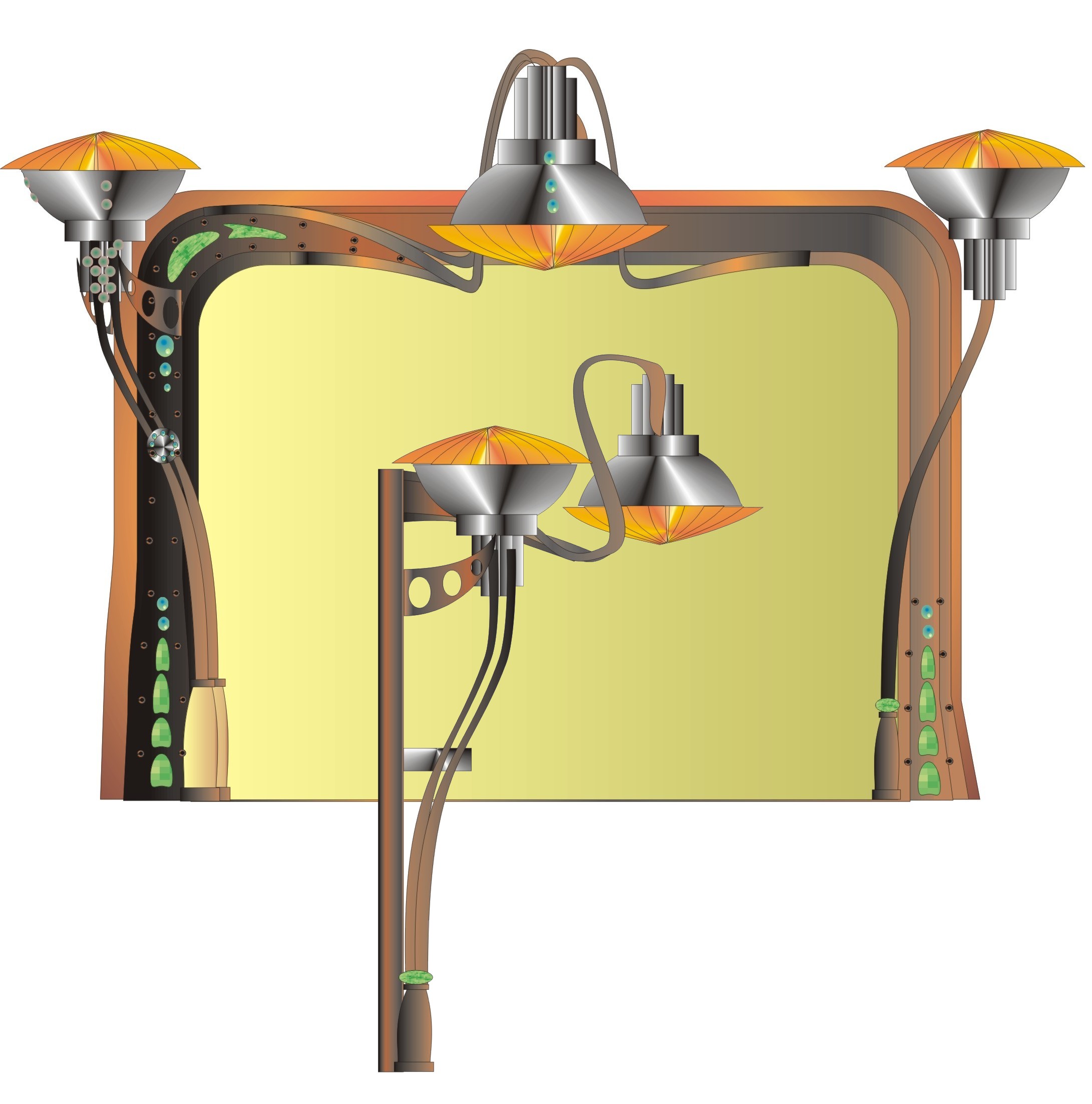 La sua progettazione nelle varie versioni è subordinata alla disponibilità di componenti adeguatamente suggestive integrabili nella struttura liberty. Per quanto sembri incredibile per esempio le parabole ed i supporti delle lampade di questo esempio, sono dei potenti proiettori aeroportuali statunitensi degli anno 70, integrati e rielaborati fino a renderli indistinguibili e perfettamente inseriti nella struttura biomorfa del portale.
