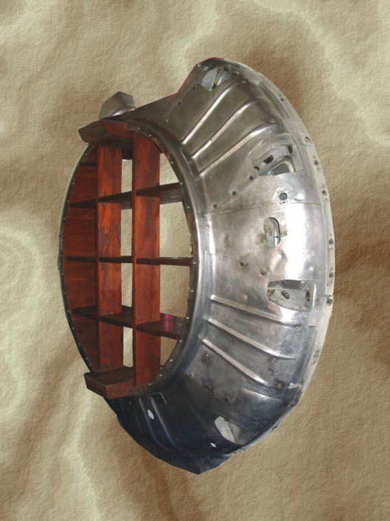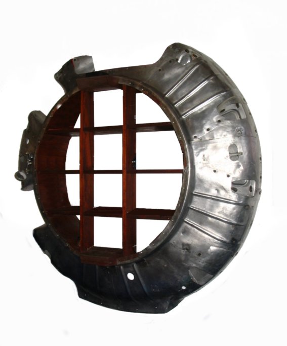 ricavato direttamente nella culla motore di un aereo degli anni 40, questo scaffale vetrina è un pezzo unico dal fascino eccezionale. alluminio avional e legno.