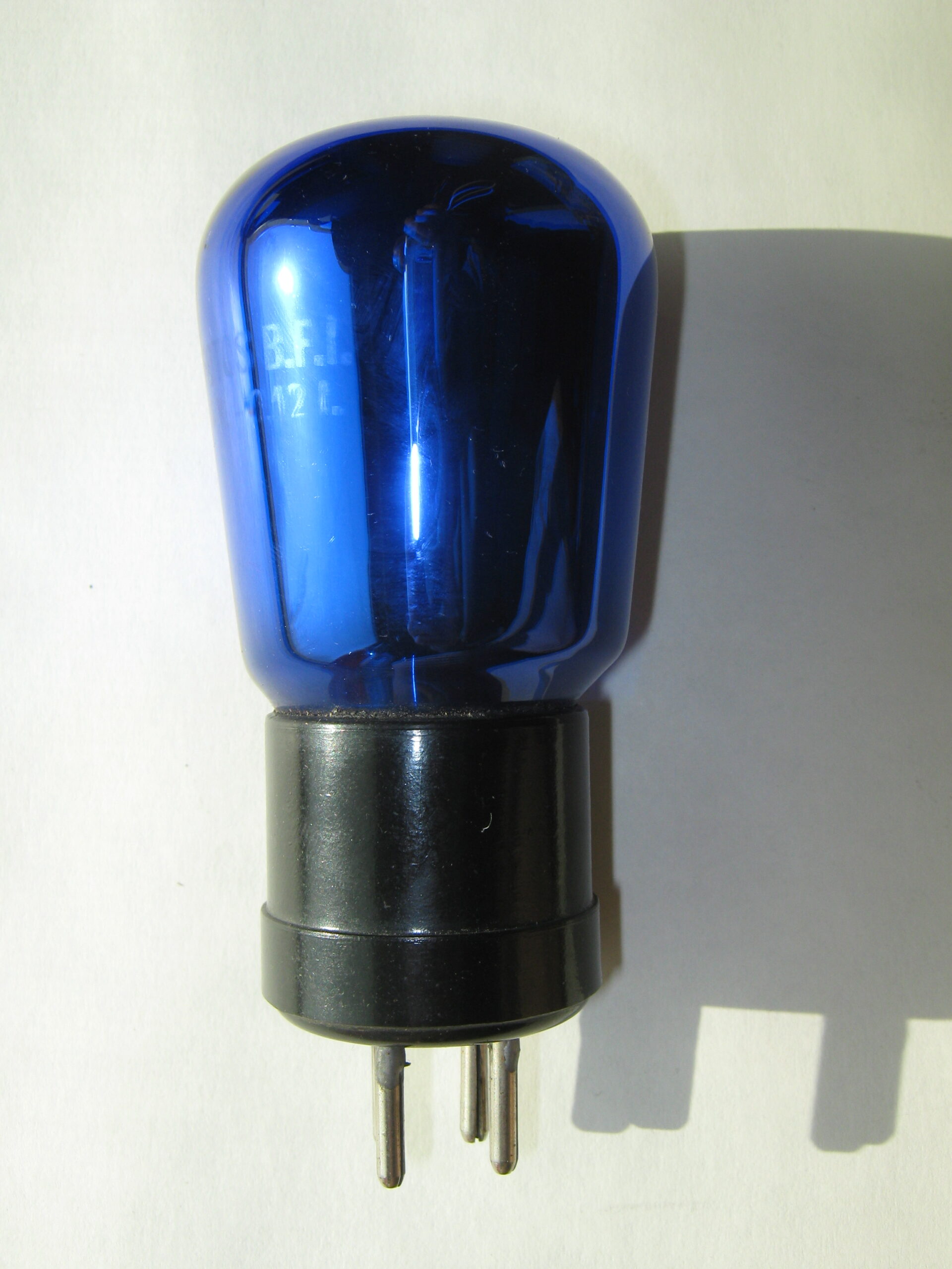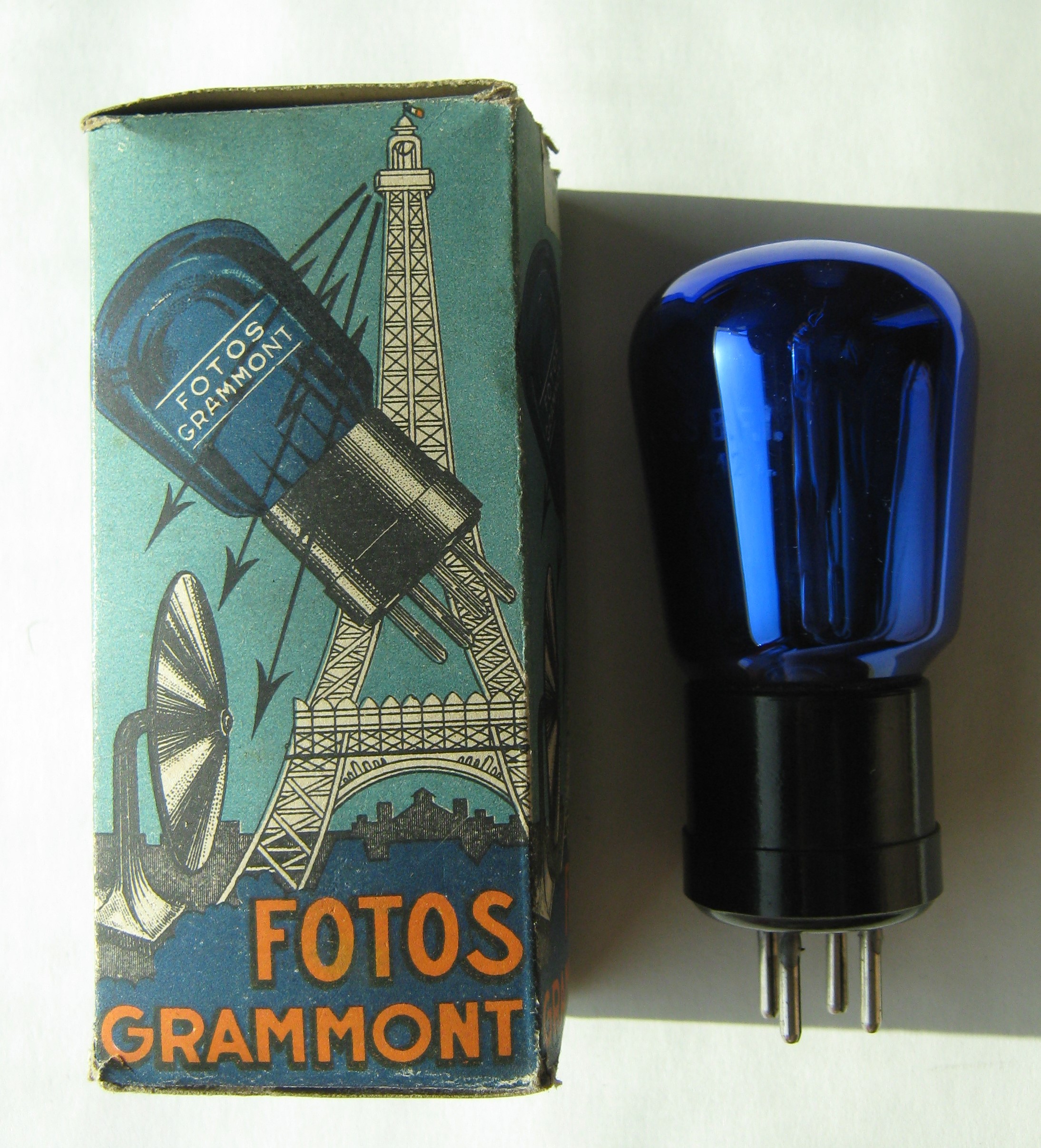 Valvola triodo Radiofotos blu a pera, con scatola originale. Nuova