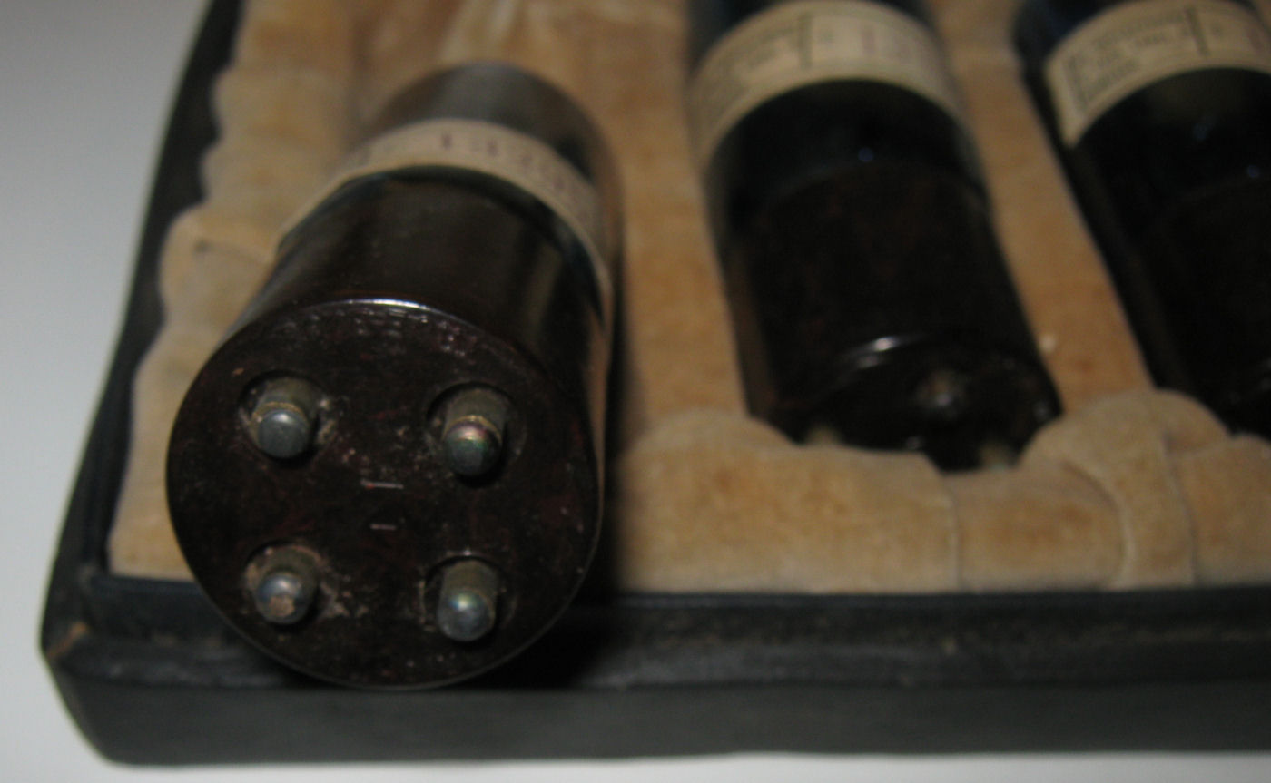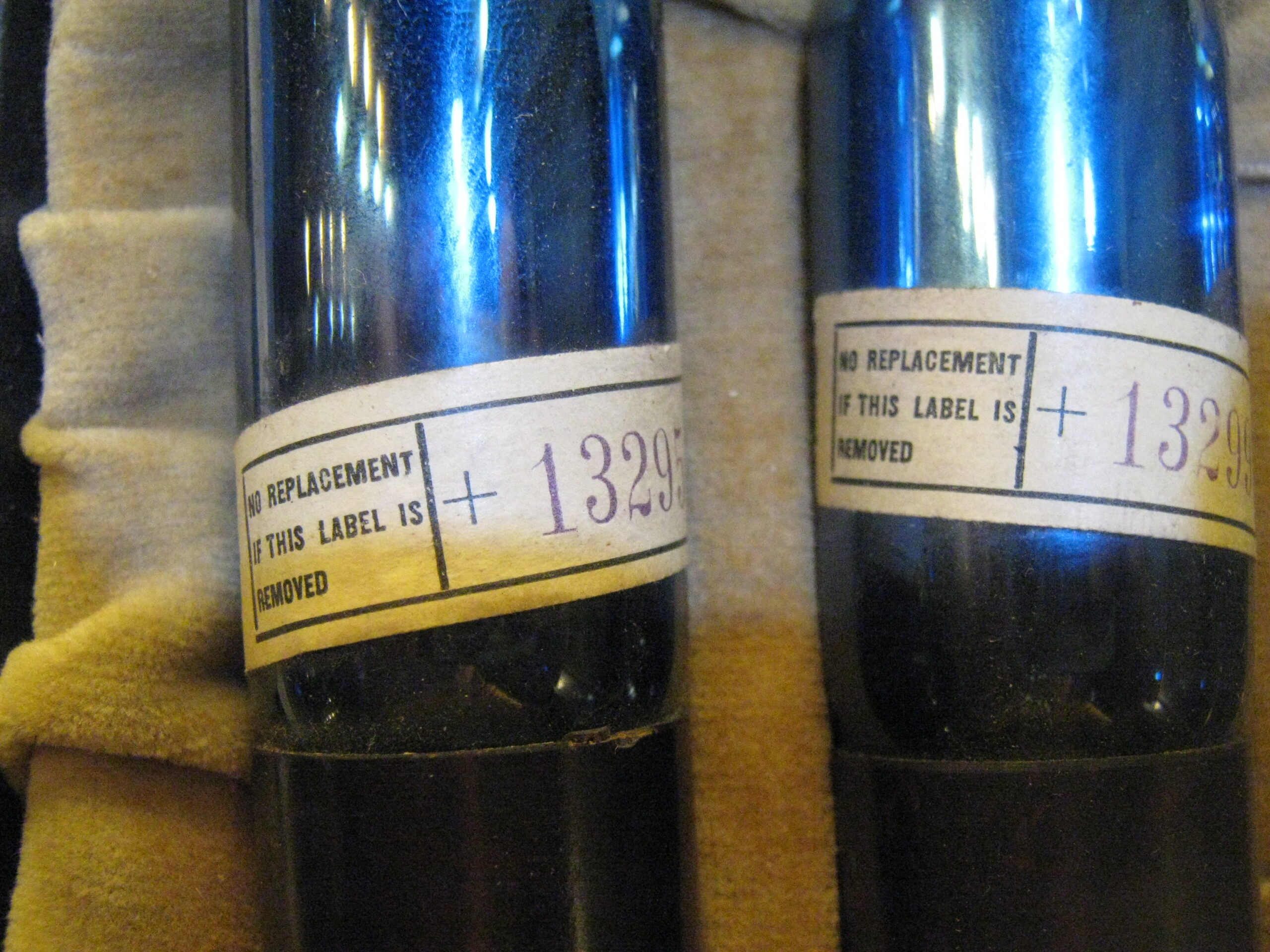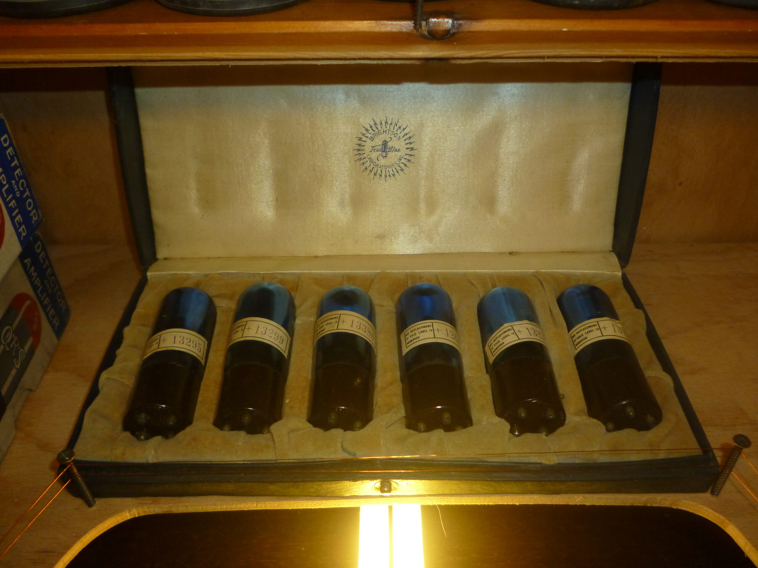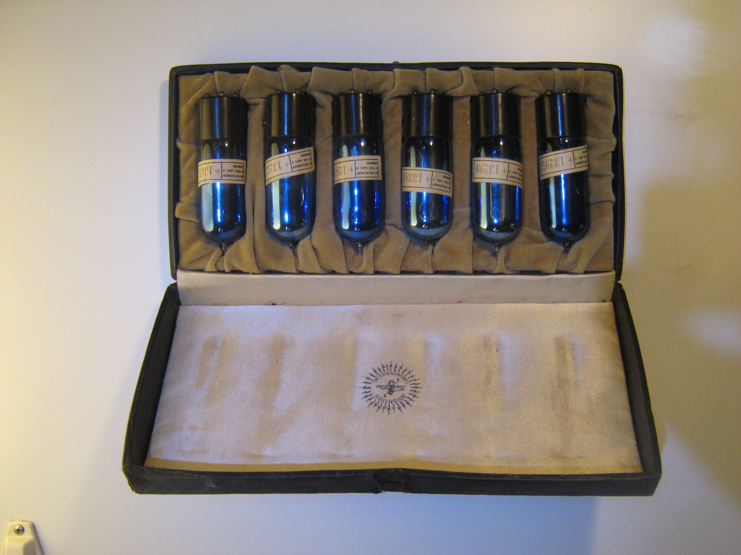 Splendida scatola originale con 6 valvole tipo True Blue D-C blue UV 99 in vetro blu.
